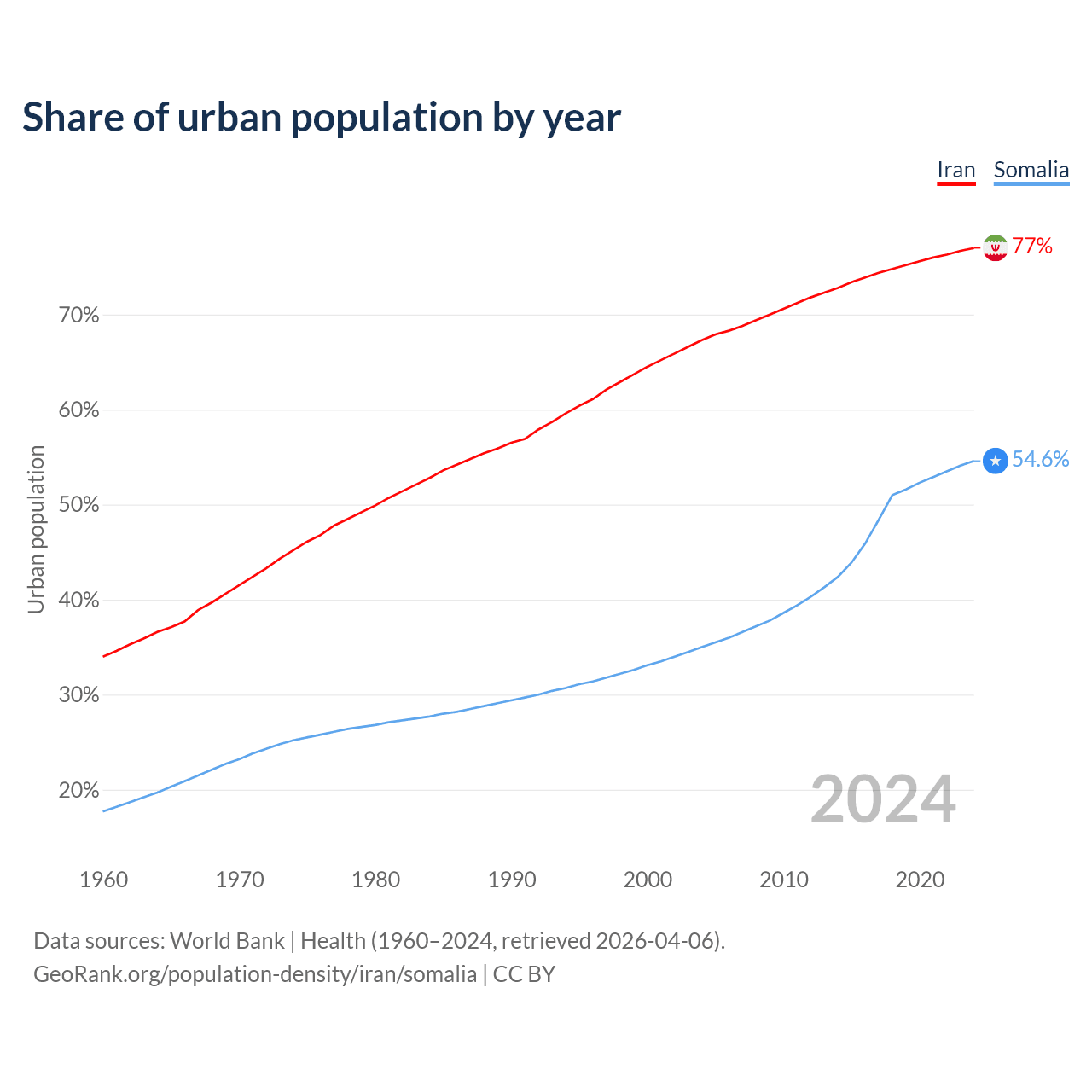 From 2004 to 2024, the share of urban population changed from 67.3% to 77% in Iran and from 35% to 54.6% in Somalia.