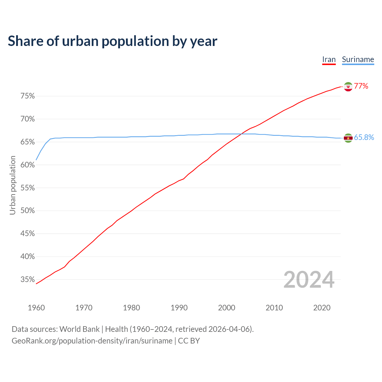 From 2004 to 2024, the share of urban population changed from 67.3% to 77% in Iran and from 66.7% to 65.8% in Suriname.