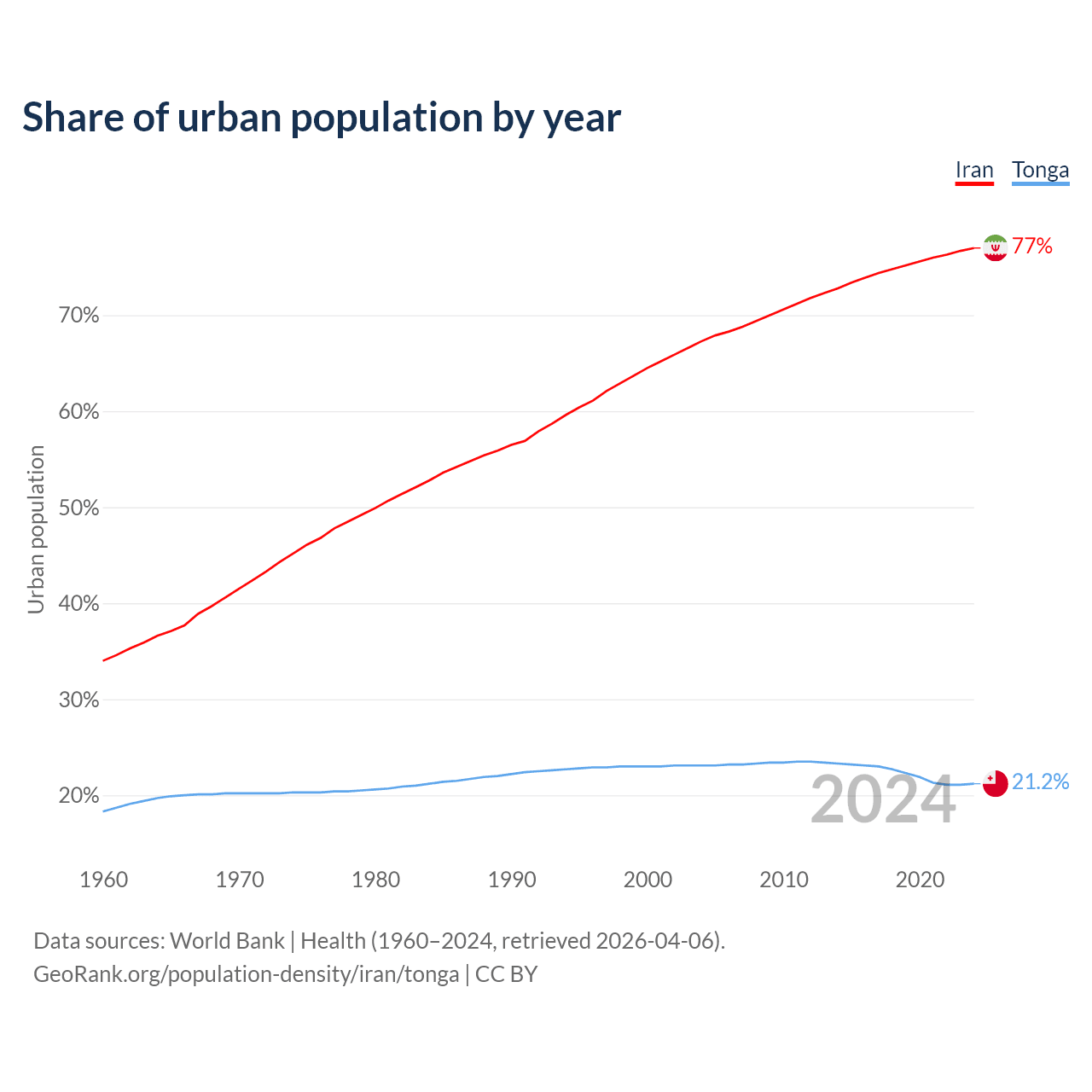 From 2004 to 2024, the share of urban population changed from 67.3% to 77% in Iran and from 23.1% to 21.2% in Tonga.
