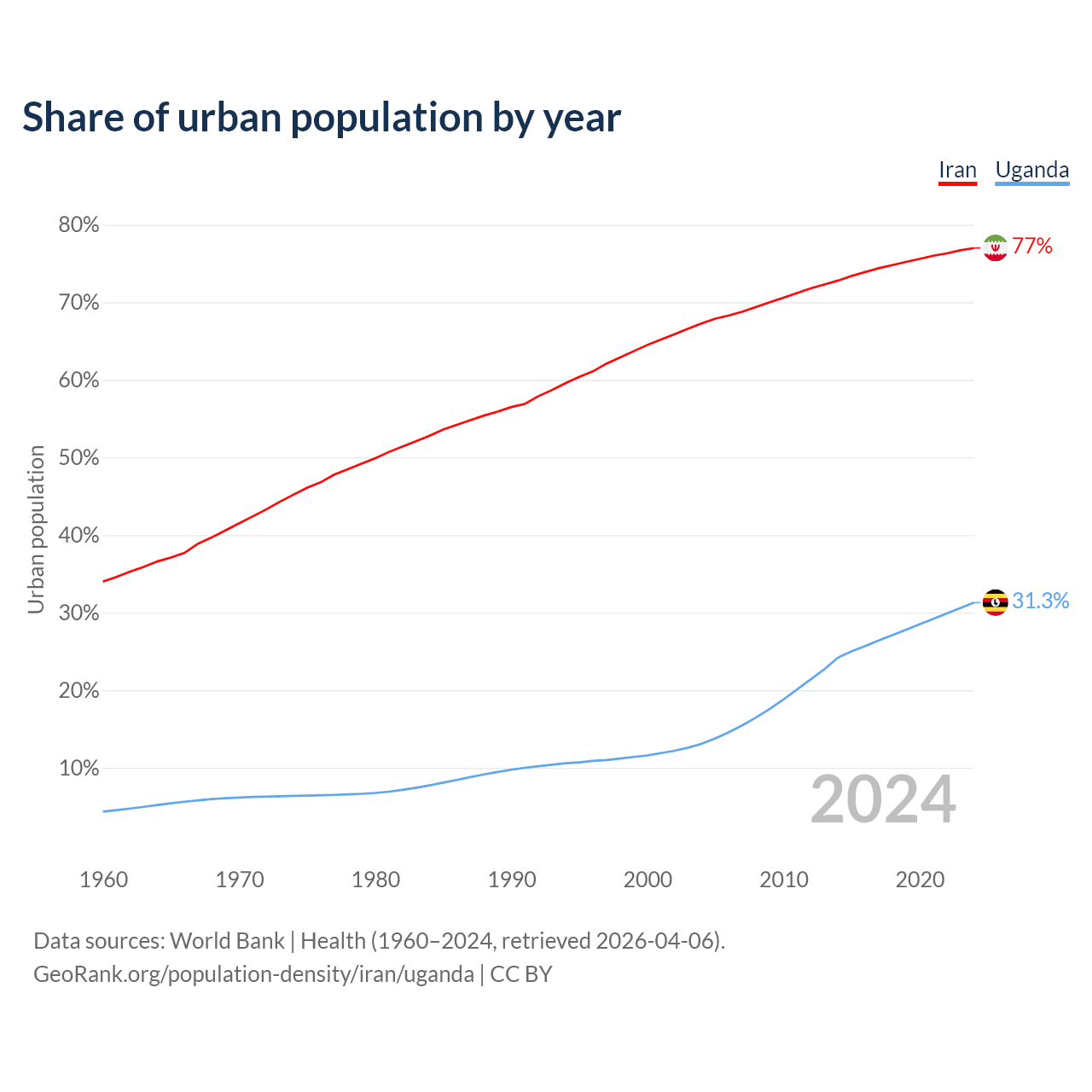 From 2004 to 2024, the share of urban population changed from 67.3% to 77% in Iran and from 13.1% to 31.3% in Uganda.