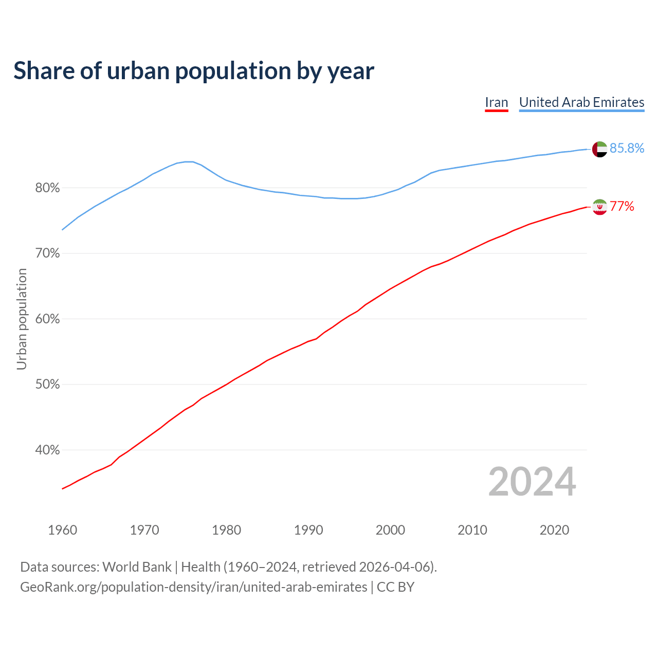 From 2004 to 2024, the share of urban population changed from 67.3% to 77% in Iran and from 81.5% to 85.8% in the United Arab Emirates.