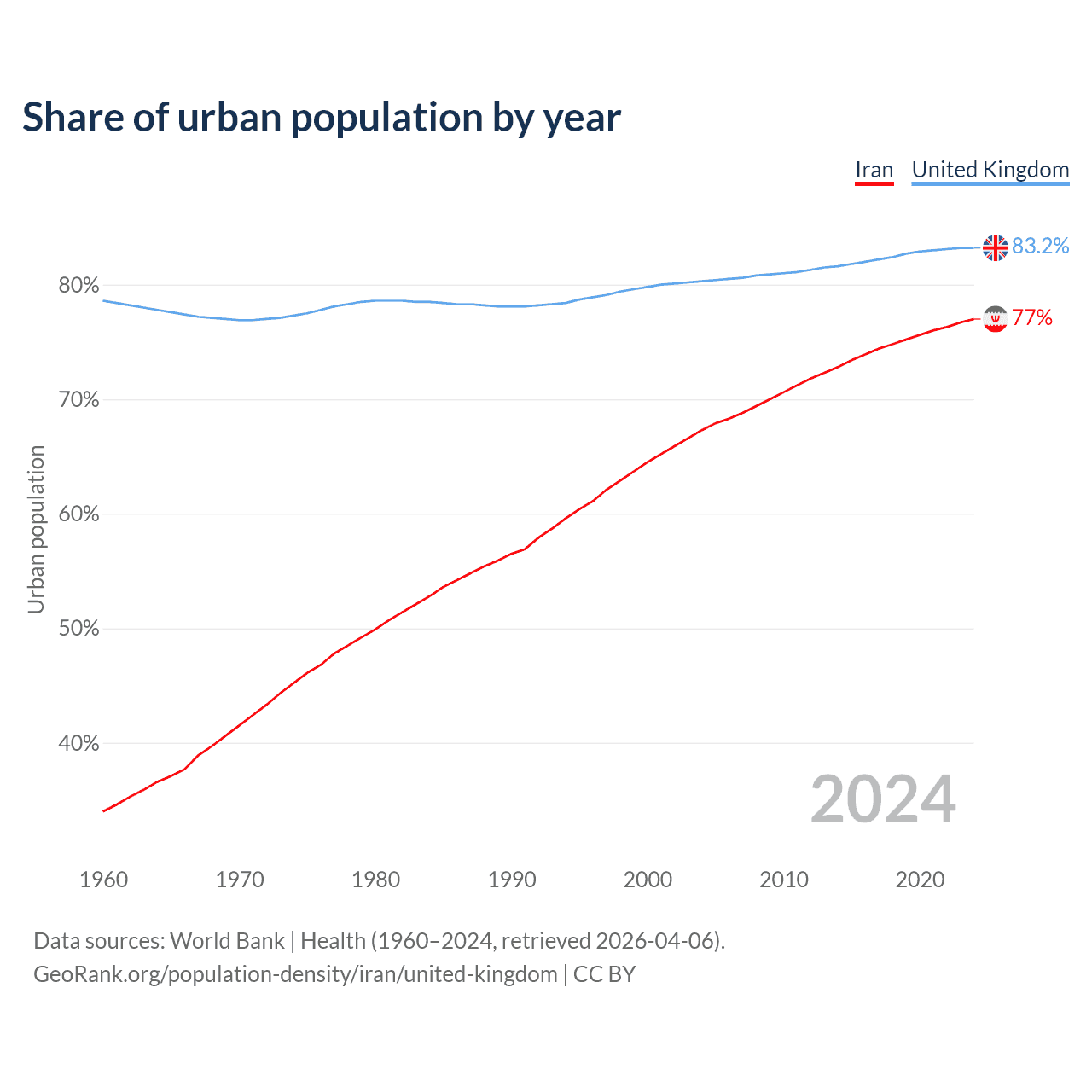 From 2004 to 2024, the share of urban population changed from 67.3% to 77% in Iran and from 80.3% to 83.2% in the United Kingdom.