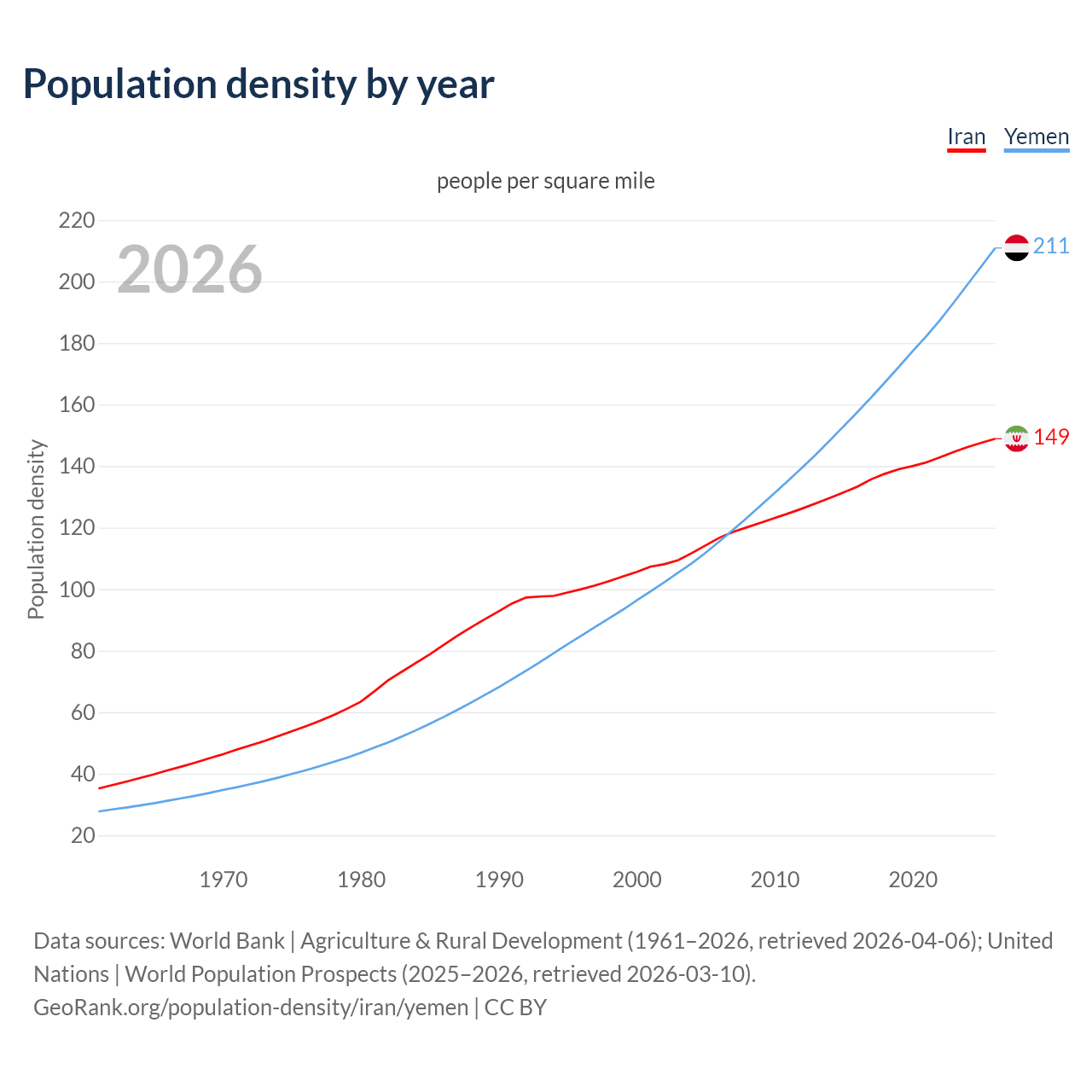 From 2006 to 2026, population density in Iran increased by 27.6%, compared to a 82.6% growth in Yemen.