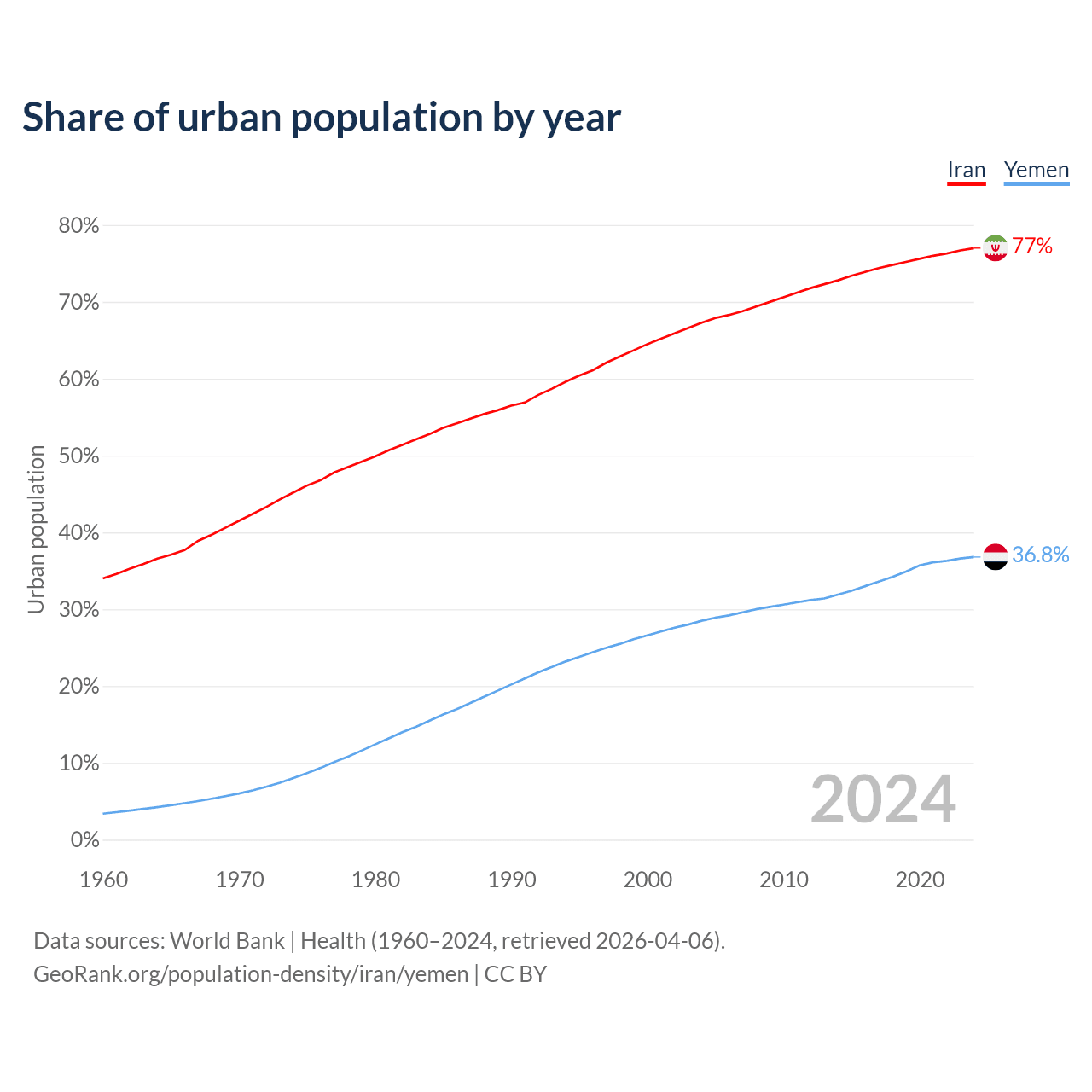From 2004 to 2024, the share of urban population changed from 67.3% to 77% in Iran and from 28.5% to 36.8% in Yemen.