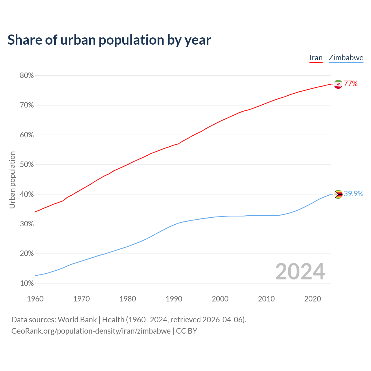 From 2004 to 2024, the share of urban population changed from 67.3% to 77% in Iran and from 32.6% to 39.9% in Zimbabwe.