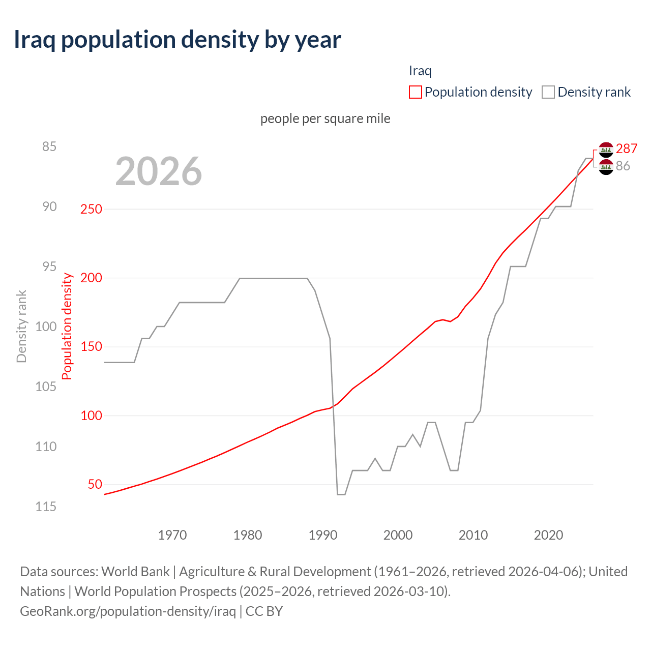 This chart shows how population density in Iraq has changed over time. From 2006 to 2026, population density increased by 69.1%. Iraq ranked 110th by population density 20 years ago and ranks 86th today.