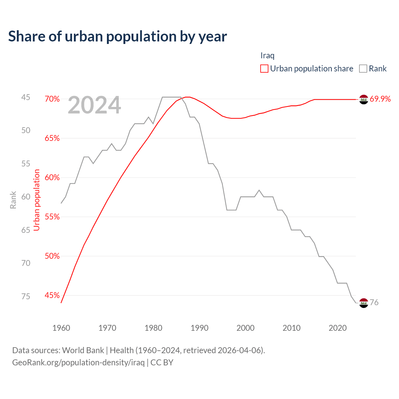 This chart shows the share of urban population in Iraq from 1960 to 2024: 44% lived in urban areas in 1960, 67.6% in 2000, and 69.9% in 2024.