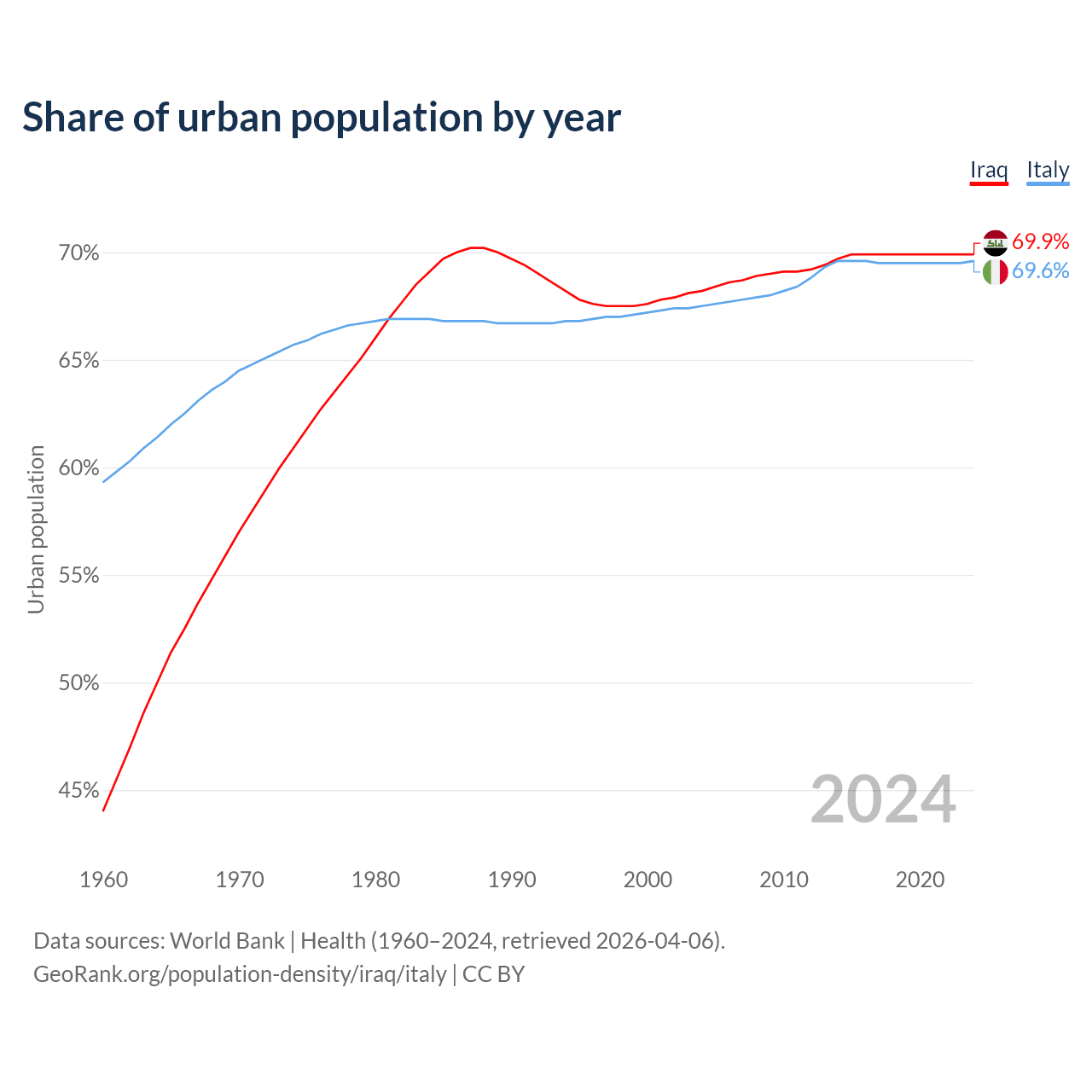 From 2004 to 2024, the share of urban population changed from 68.2% to 69.9% in Iraq and from 67.5% to 69.6% in Italy.