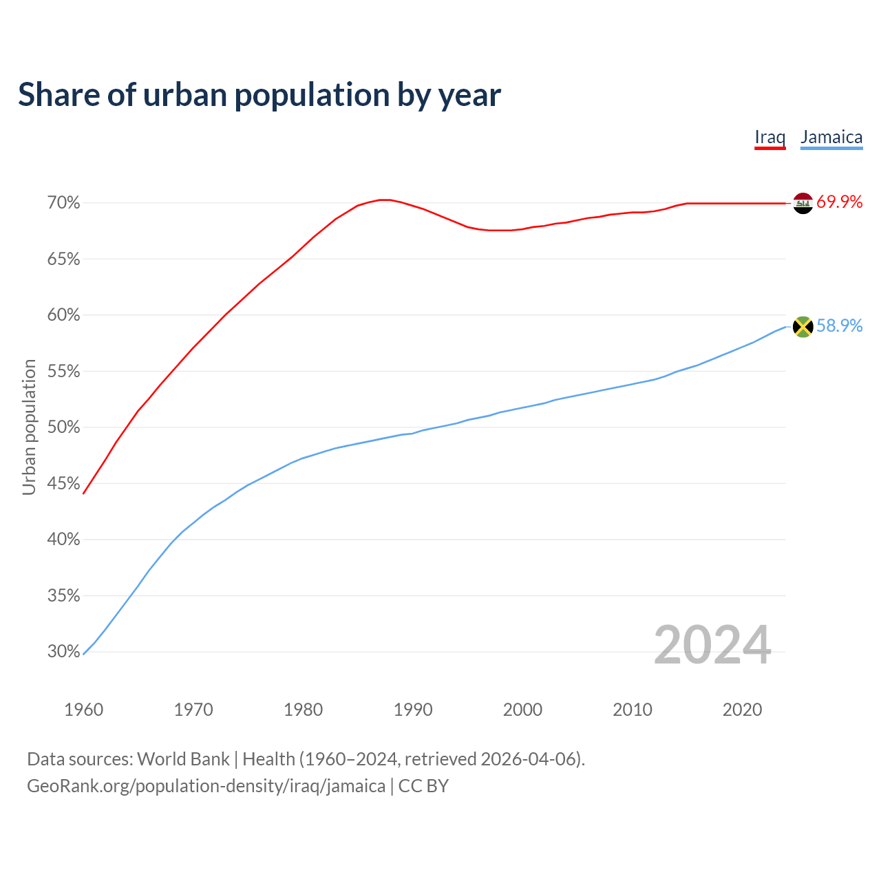 From 2004 to 2024, the share of urban population changed from 68.2% to 69.9% in Iraq and from 52.6% to 58.9% in Jamaica.