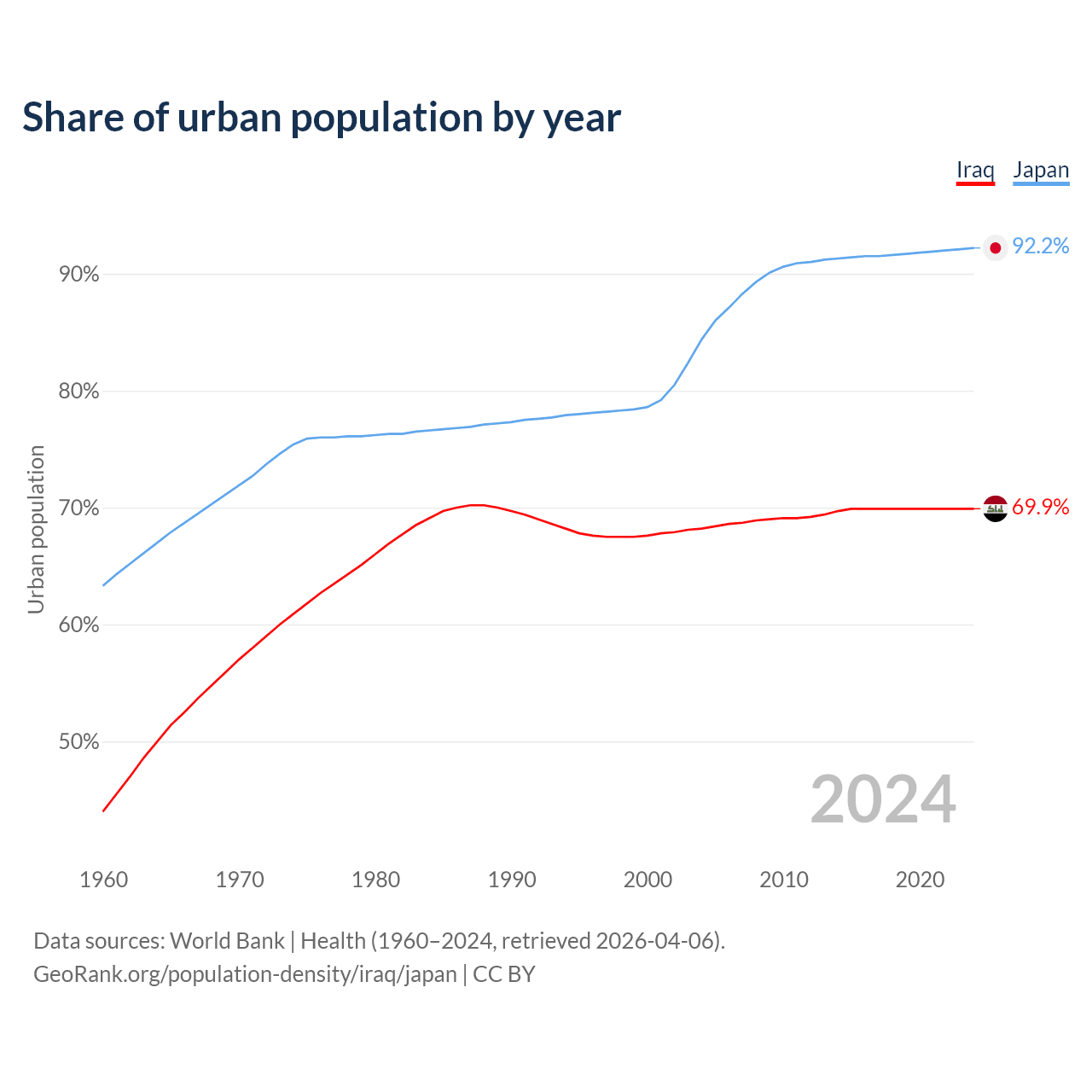 From 2004 to 2024, the share of urban population changed from 68.2% to 69.9% in Iraq and from 84.4% to 92.2% in Japan.