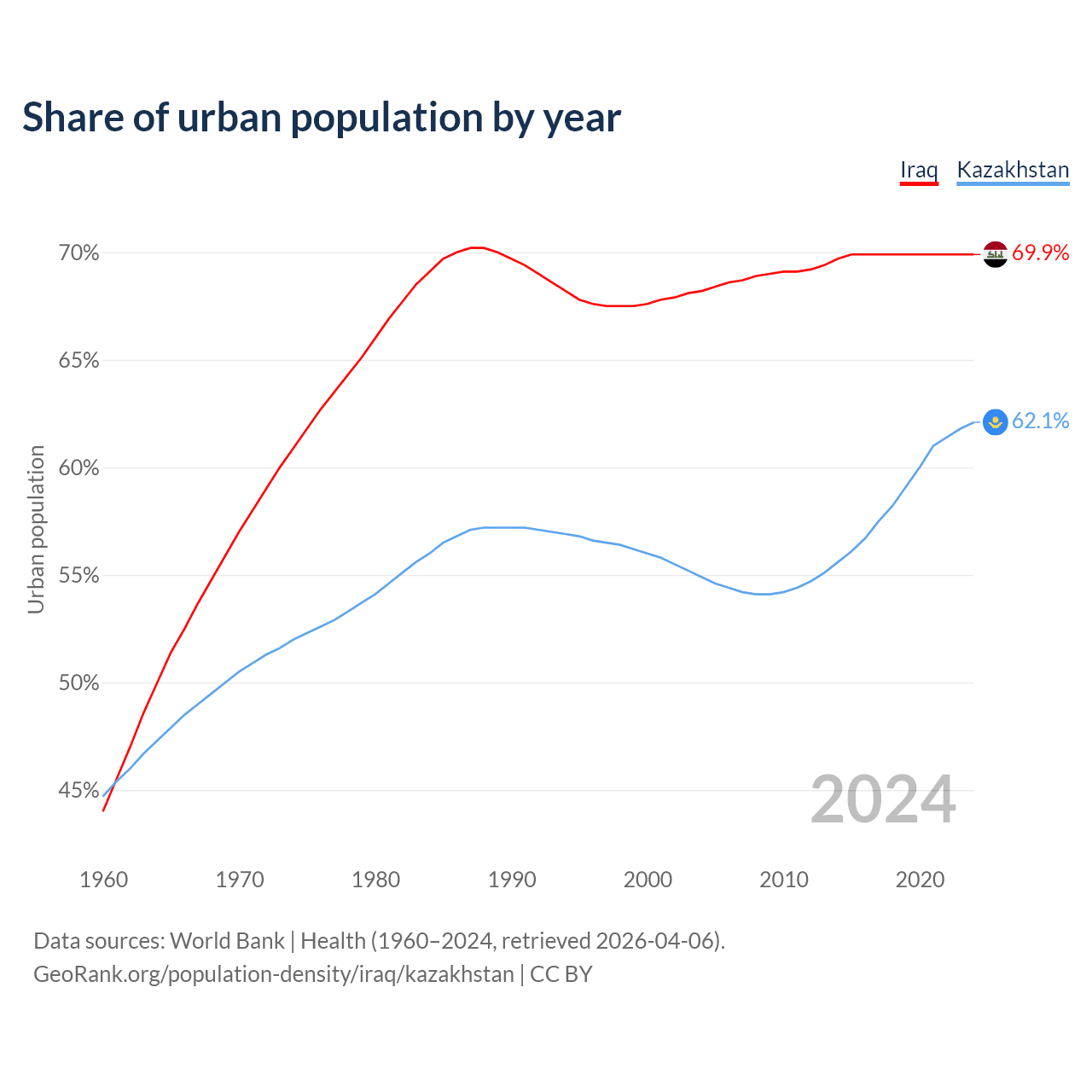 From 2004 to 2024, the share of urban population changed from 68.2% to 69.9% in Iraq and from 54.9% to 62.1% in Kazakhstan.