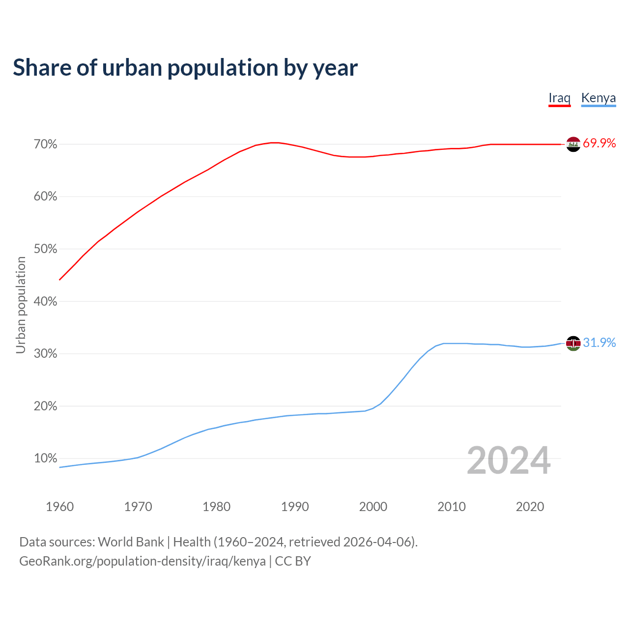From 2004 to 2024, the share of urban population changed from 68.2% to 69.9% in Iraq and from 25.4% to 31.9% in Kenya.