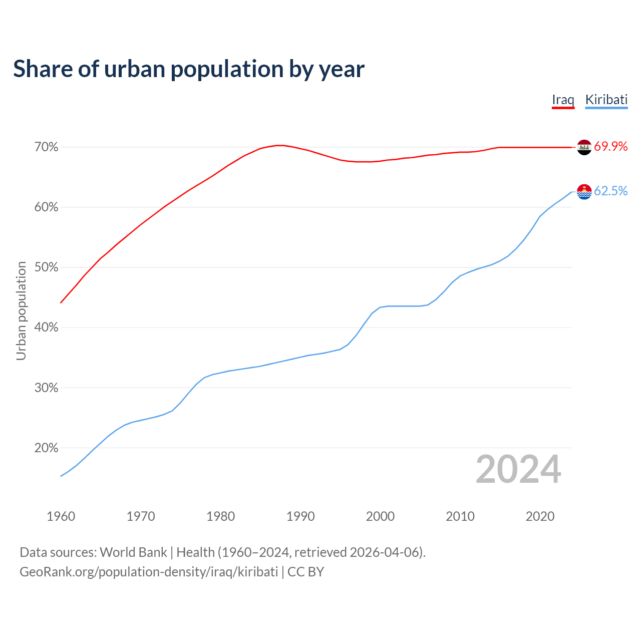 From 2004 to 2024, the share of urban population changed from 68.2% to 69.9% in Iraq and from 43.5% to 62.5% in Kiribati.