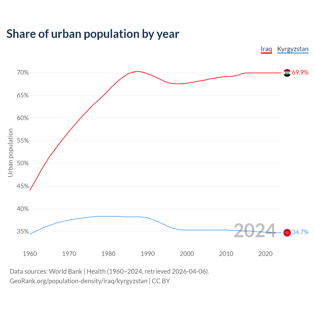 From 2004 to 2024, the share of urban population changed from 68.2% to 69.9% in Iraq and from 35.3% to 34.7% in Kyrgyzstan.