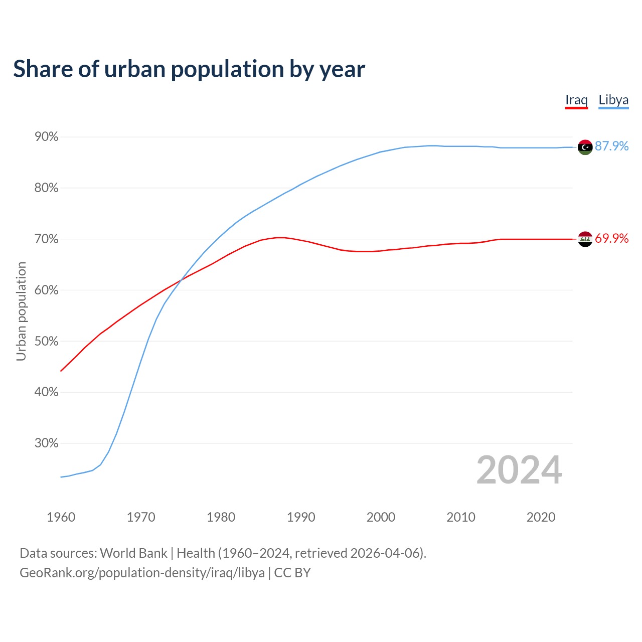 From 2004 to 2024, the share of urban population changed from 68.2% to 69.9% in Iraq and from 88% to 87.9% in Libya.