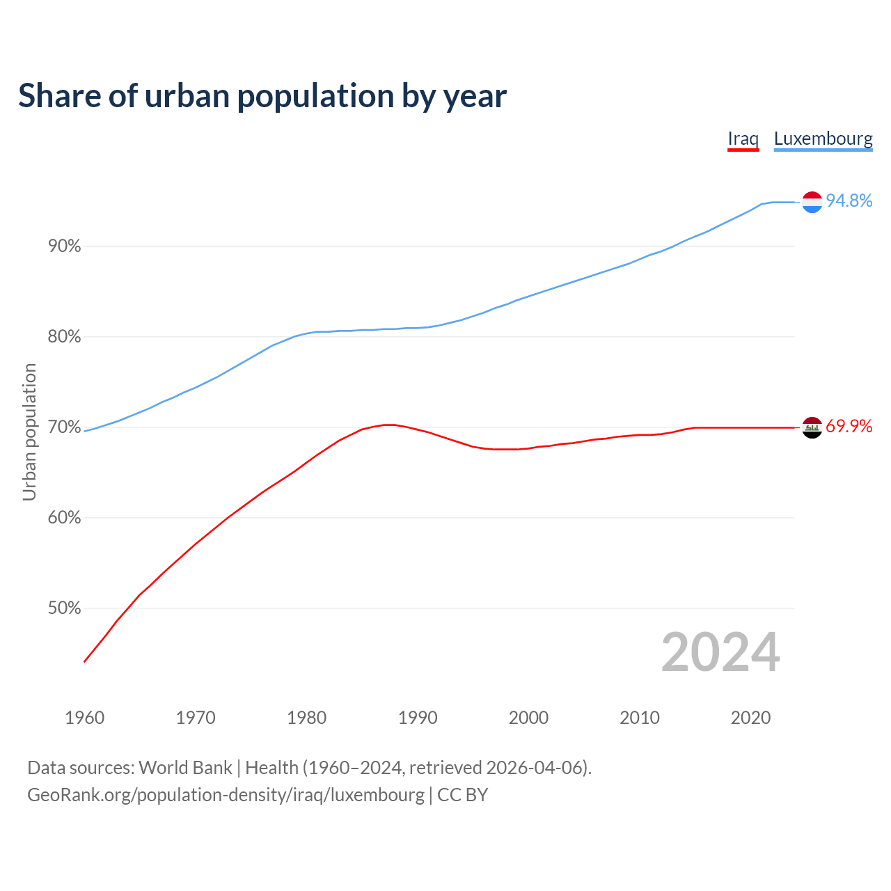 From 2004 to 2024, the share of urban population changed from 68.2% to 69.9% in Iraq and from 86% to 94.8% in Luxembourg.