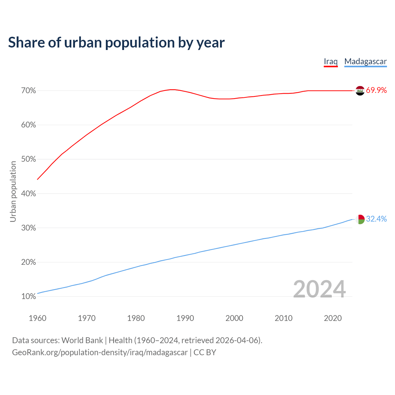 From 2004 to 2024, the share of urban population changed from 68.2% to 69.9% in Iraq and from 26.2% to 32.4% in Madagascar.