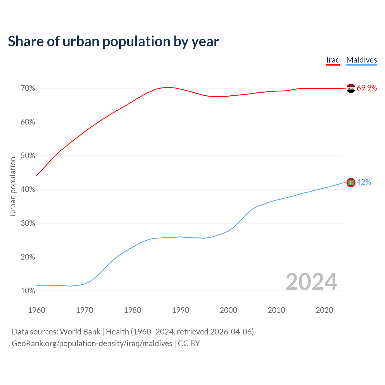 From 2004 to 2024, the share of urban population changed from 68.2% to 69.9% in Iraq and from 32.9% to 42% in Maldives.
