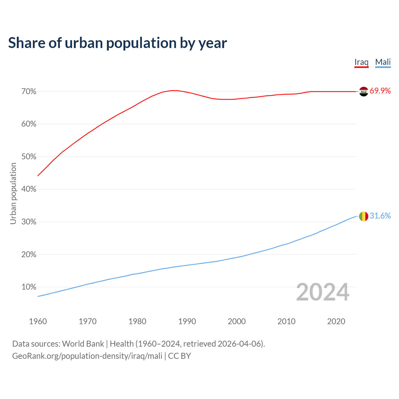 From 2004 to 2024, the share of urban population changed from 68.2% to 69.9% in Iraq and from 20.5% to 31.6% in Mali.