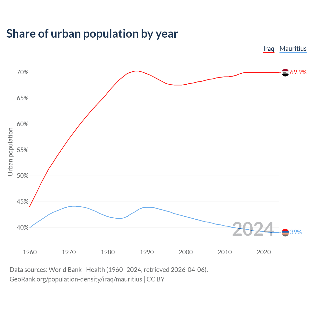 From 2004 to 2024, the share of urban population changed from 68.2% to 69.9% in Iraq and from 41.3% to 39% in Mauritius.