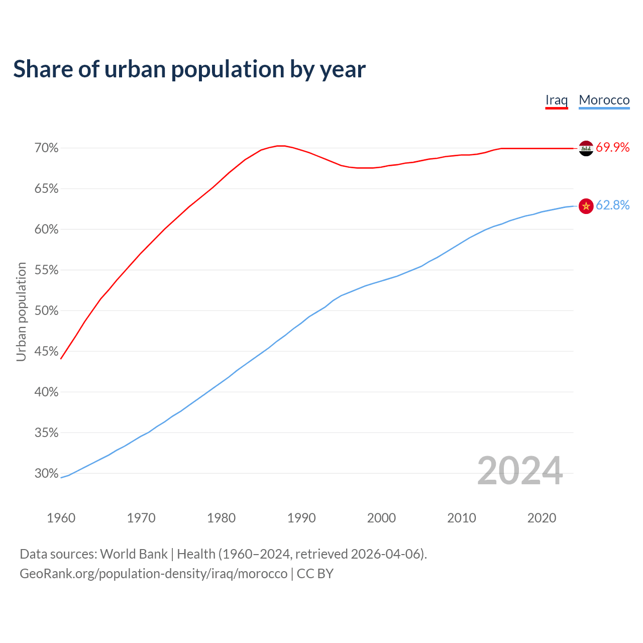 From 2004 to 2024, the share of urban population changed from 68.2% to 69.9% in Iraq and from 55% to 62.8% in Morocco.