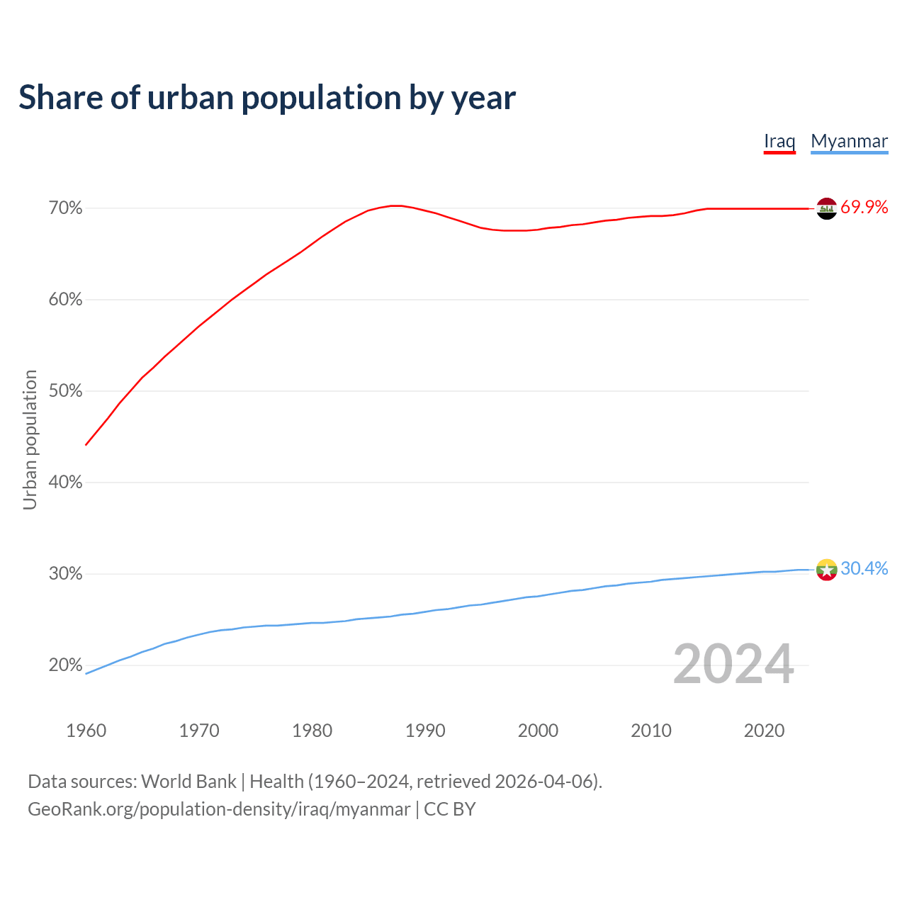 From 2004 to 2024, the share of urban population changed from 68.2% to 69.9% in Iraq and from 28.2% to 30.4% in Myanmar.
