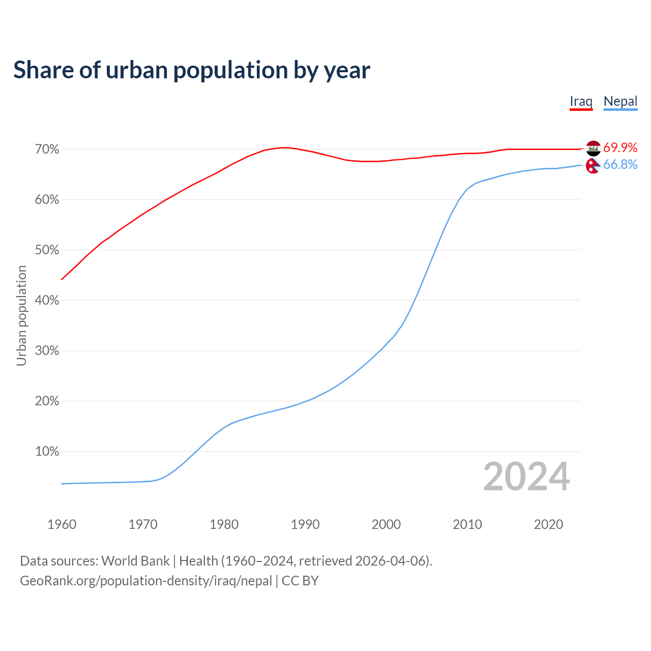 From 2004 to 2024, the share of urban population changed from 68.2% to 69.9% in Iraq and from 41.6% to 66.8% in Nepal.