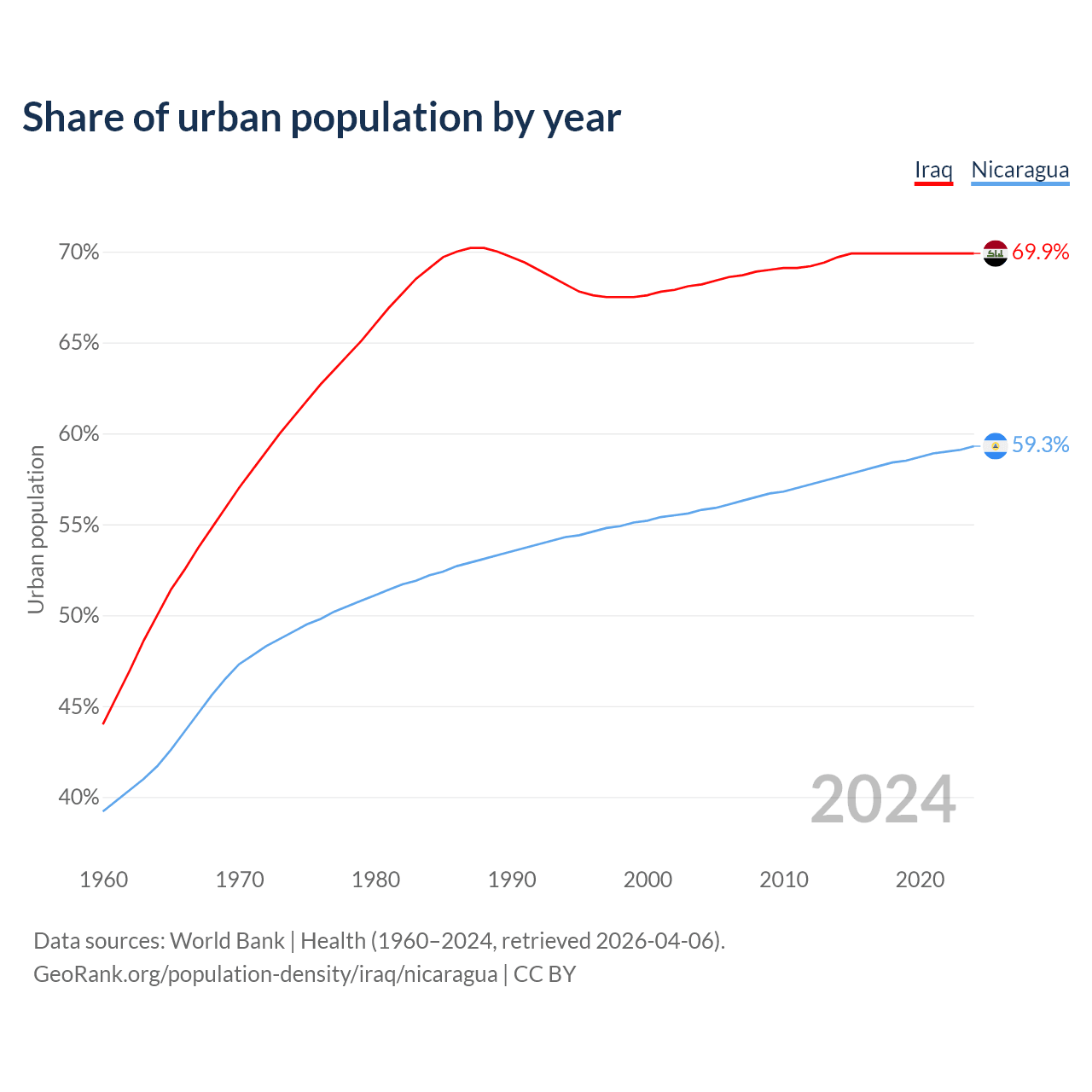 From 2004 to 2024, the share of urban population changed from 68.2% to 69.9% in Iraq and from 55.8% to 59.3% in Nicaragua.
