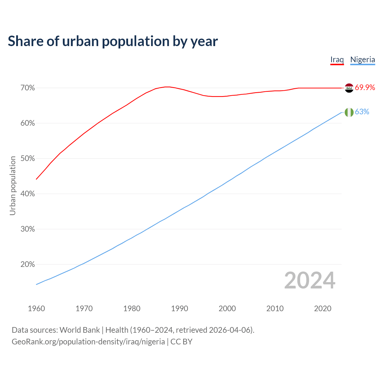 From 2004 to 2024, the share of urban population changed from 68.2% to 69.9% in Iraq and from 46.7% to 63% in Nigeria.