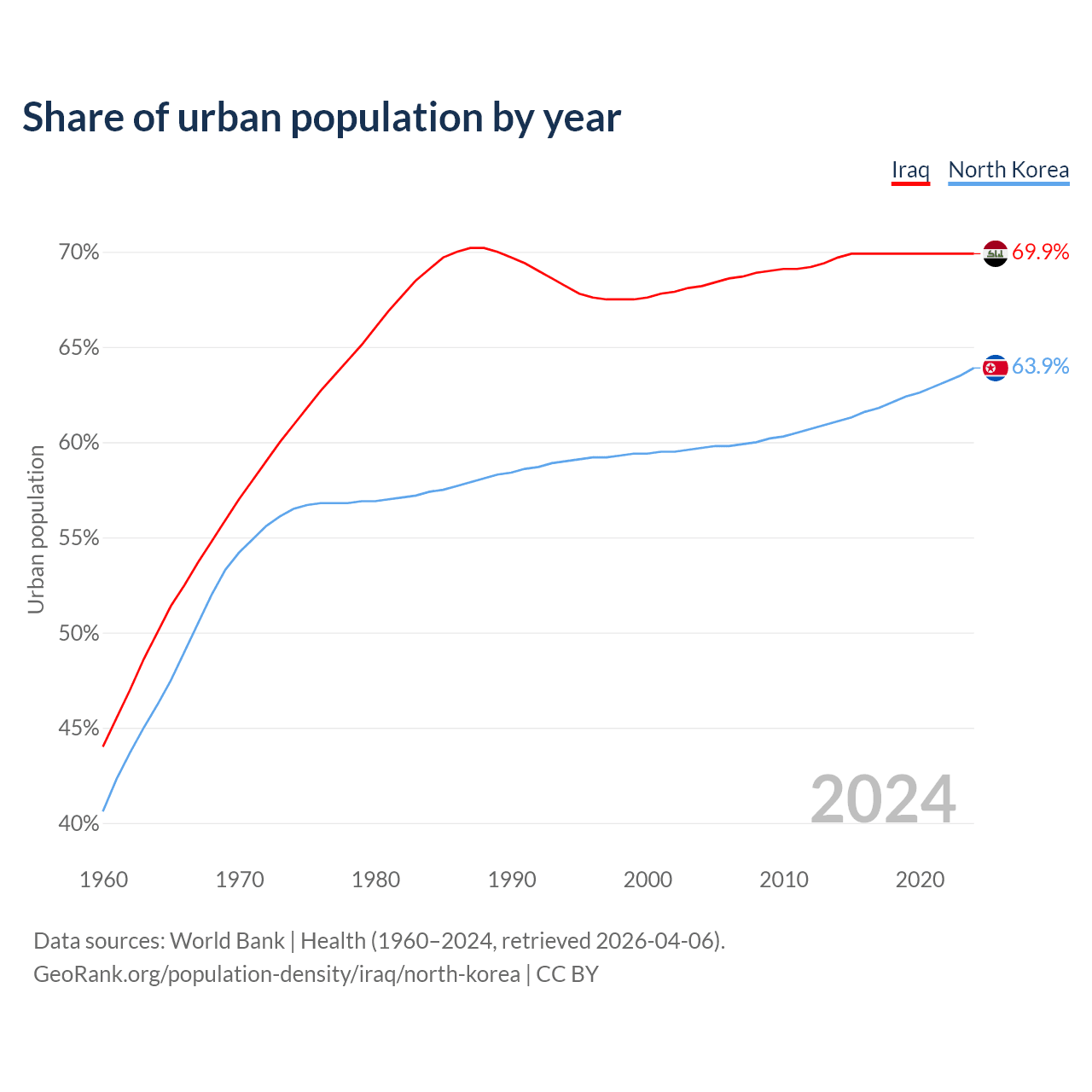 From 2004 to 2024, the share of urban population changed from 68.2% to 69.9% in Iraq and from 59.7% to 63.9% in North Korea.