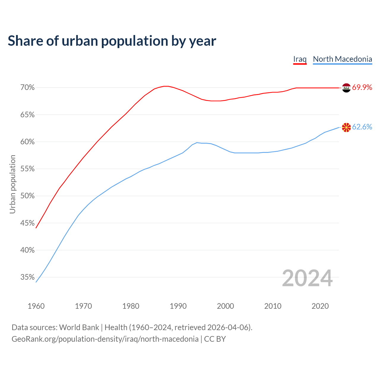 From 2004 to 2024, the share of urban population changed from 68.2% to 69.9% in Iraq and from 57.9% to 62.6% in North Macedonia.