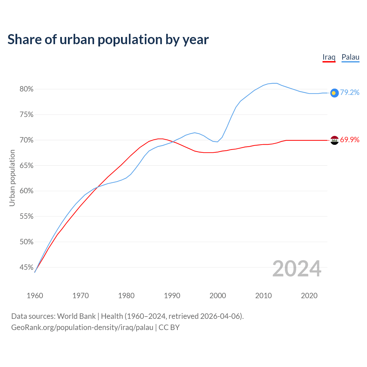 From 2004 to 2024, the share of urban population changed from 68.2% to 69.9% in Iraq and from 76.4% to 79.2% in Palau.