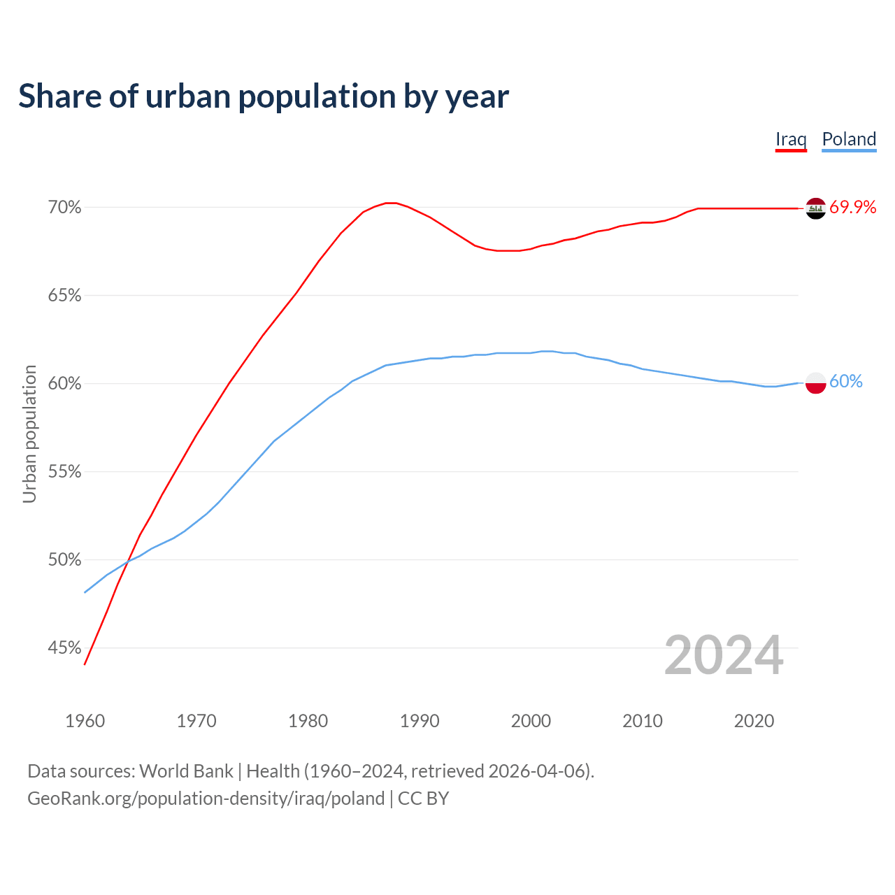 From 2004 to 2024, the share of urban population changed from 68.2% to 69.9% in Iraq and from 61.7% to 60% in Poland.