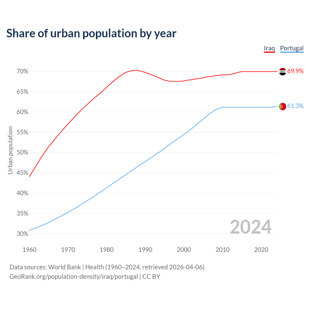 From 2004 to 2024, the share of urban population changed from 68.2% to 69.9% in Iraq and from 57.4% to 61.3% in Portugal.