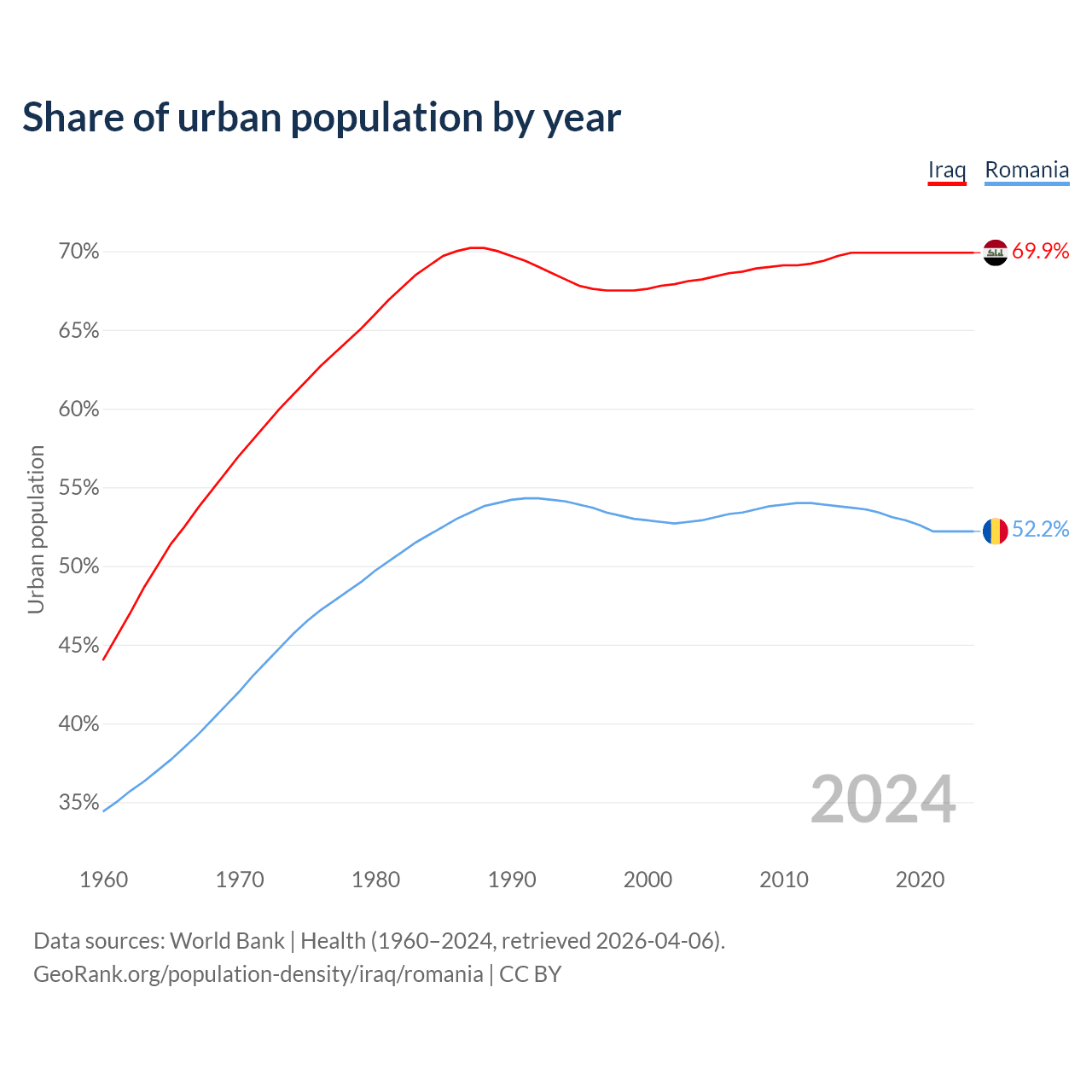 From 2004 to 2024, the share of urban population changed from 68.2% to 69.9% in Iraq and from 52.9% to 52.2% in Romania.