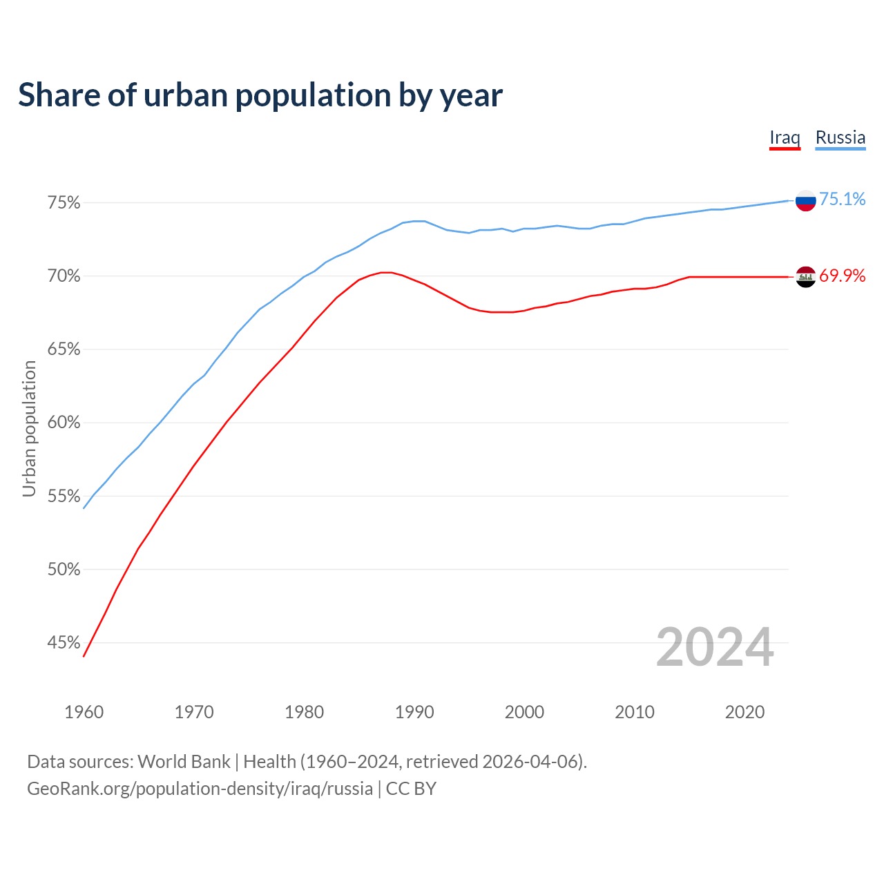 From 2004 to 2024, the share of urban population changed from 68.2% to 69.9% in Iraq and from 73.3% to 75.1% in Russia.