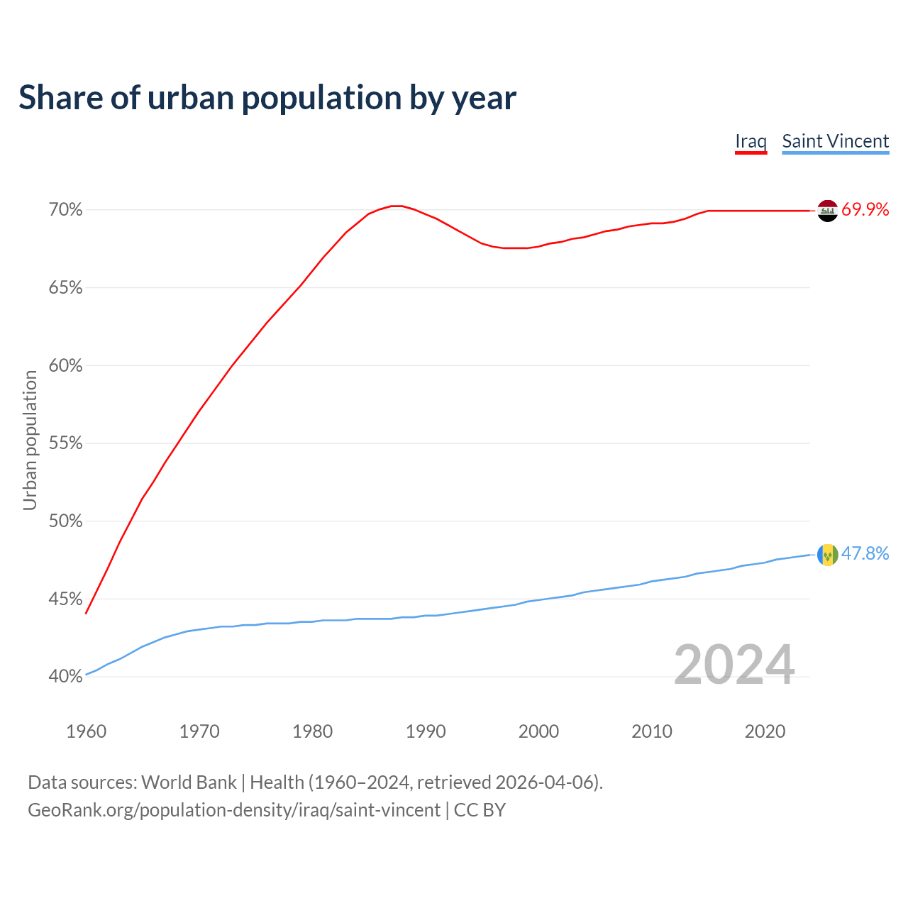 From 2004 to 2024, the share of urban population changed from 68.2% to 69.9% in Iraq and from 45.4% to 47.8% in Saint Vincent.