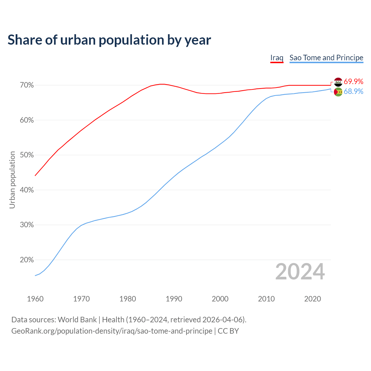 From 2004 to 2024, the share of urban population changed from 68.2% to 69.9% in Iraq and from 57.9% to 68.9% in Sao Tome and Principe.