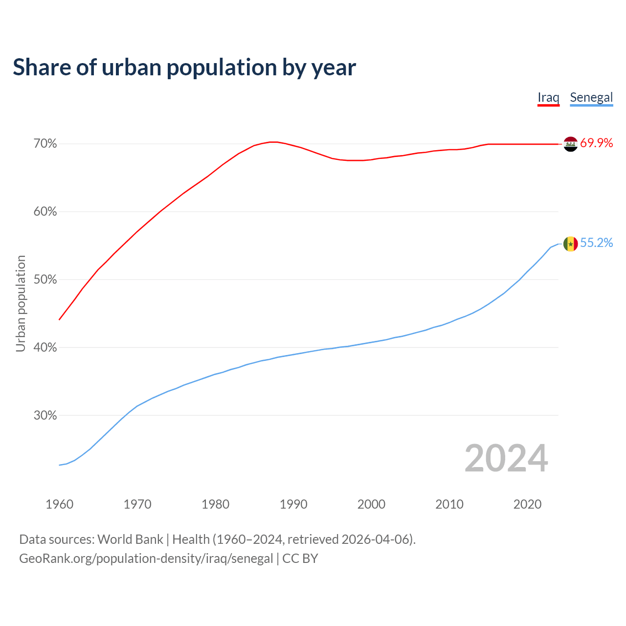 From 2004 to 2024, the share of urban population changed from 68.2% to 69.9% in Iraq and from 41.6% to 55.2% in Senegal.