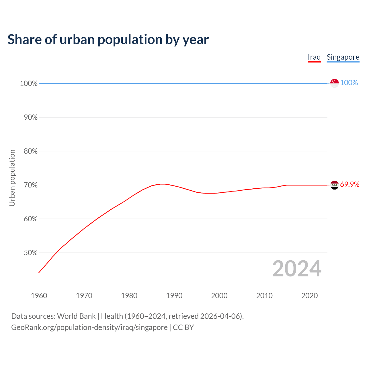 From 2004 to 2024, the share of urban population changed from 68.2% to 69.9% in Iraq and from 100% to 100% in Singapore.