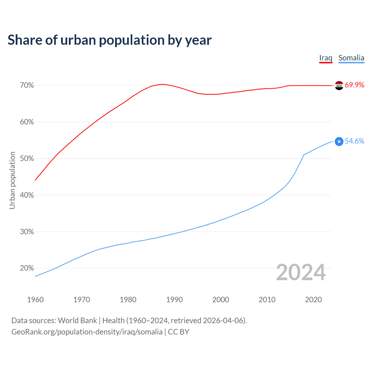 From 2004 to 2024, the share of urban population changed from 68.2% to 69.9% in Iraq and from 35% to 54.6% in Somalia.