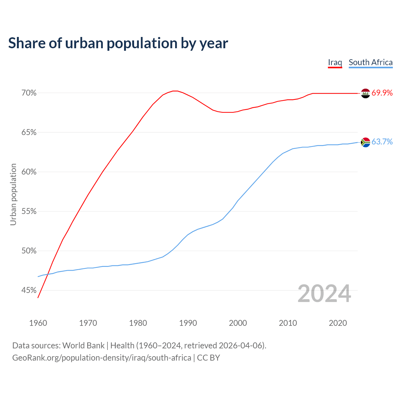 From 2004 to 2024, the share of urban population changed from 68.2% to 69.9% in Iraq and from 59.1% to 63.7% in South Africa.
