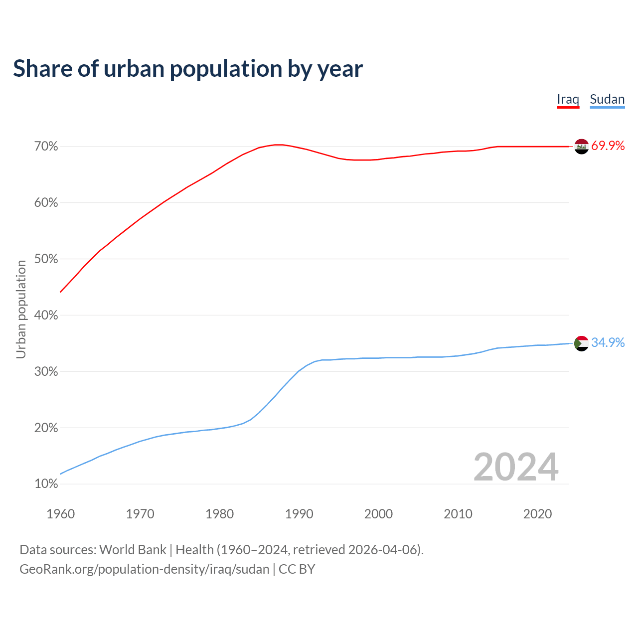From 2004 to 2024, the share of urban population changed from 68.2% to 69.9% in Iraq and from 32.4% to 34.9% in Sudan.