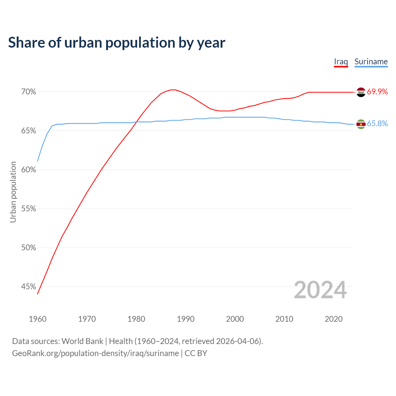 From 2004 to 2024, the share of urban population changed from 68.2% to 69.9% in Iraq and from 66.7% to 65.8% in Suriname.