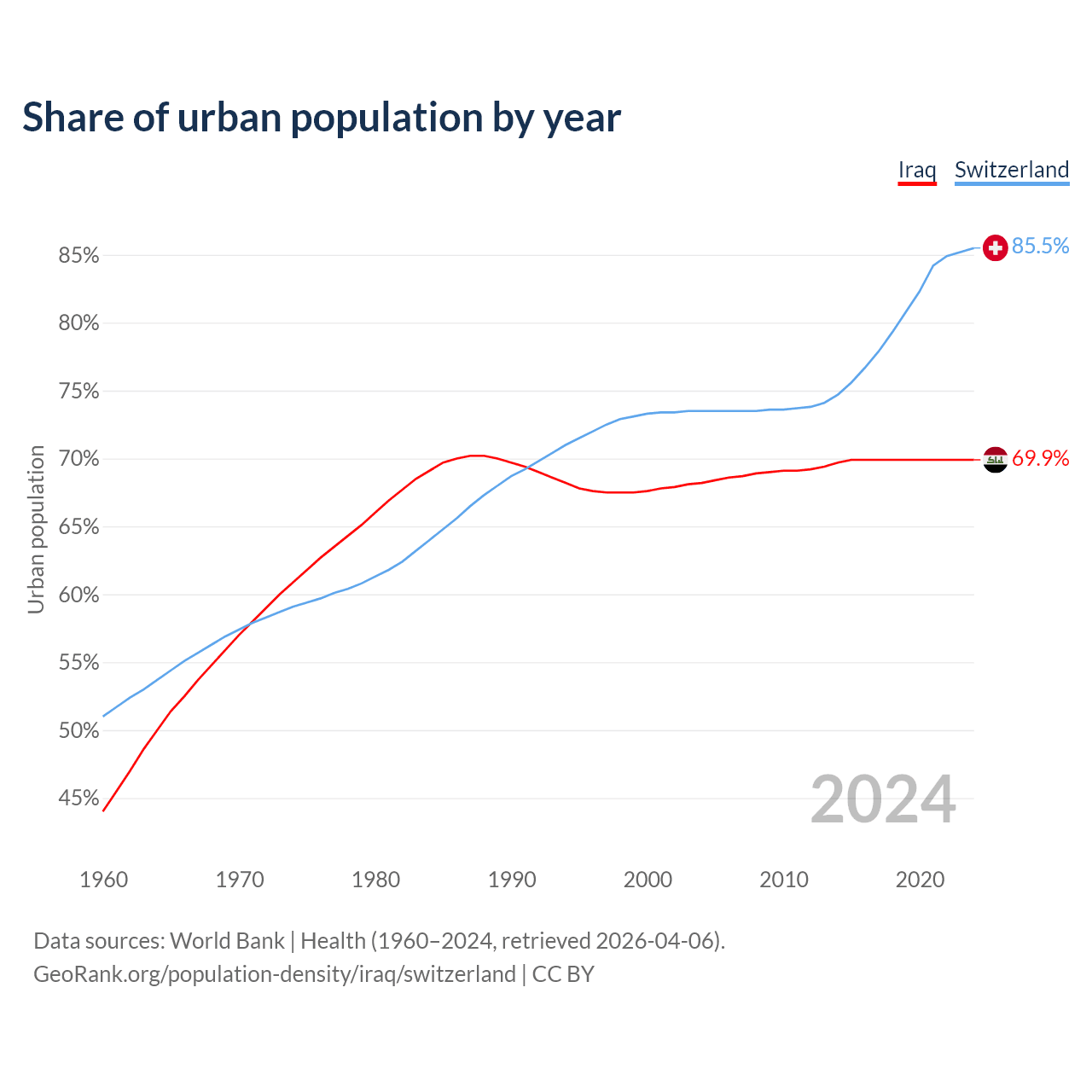 From 2004 to 2024, the share of urban population changed from 68.2% to 69.9% in Iraq and from 73.5% to 85.5% in Switzerland.