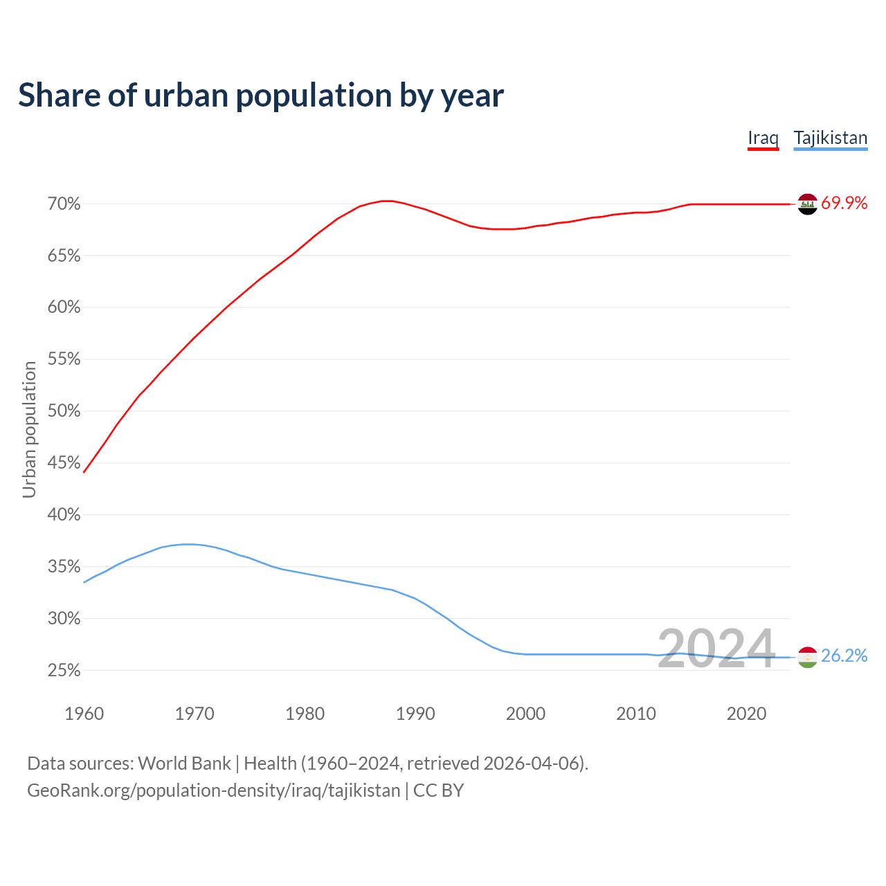 From 2004 to 2024, the share of urban population changed from 68.2% to 69.9% in Iraq and from 26.5% to 26.2% in Tajikistan.