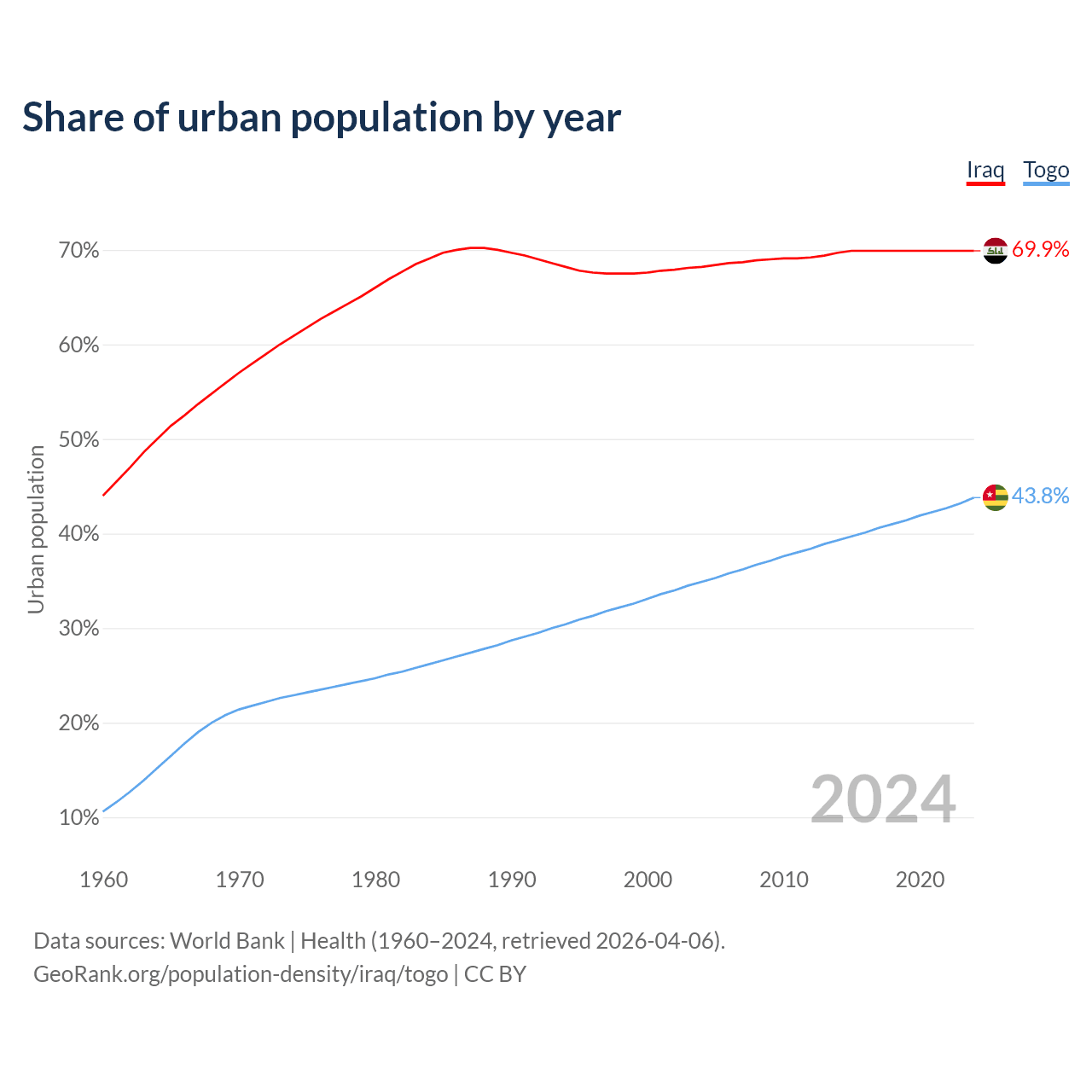 From 2004 to 2024, the share of urban population changed from 68.2% to 69.9% in Iraq and from 34.9% to 43.8% in Togo.