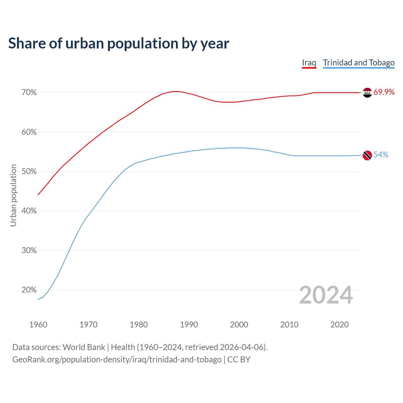 From 2004 to 2024, the share of urban population changed from 68.2% to 69.9% in Iraq and from 55.6% to 54% in Trinidad and Tobago.