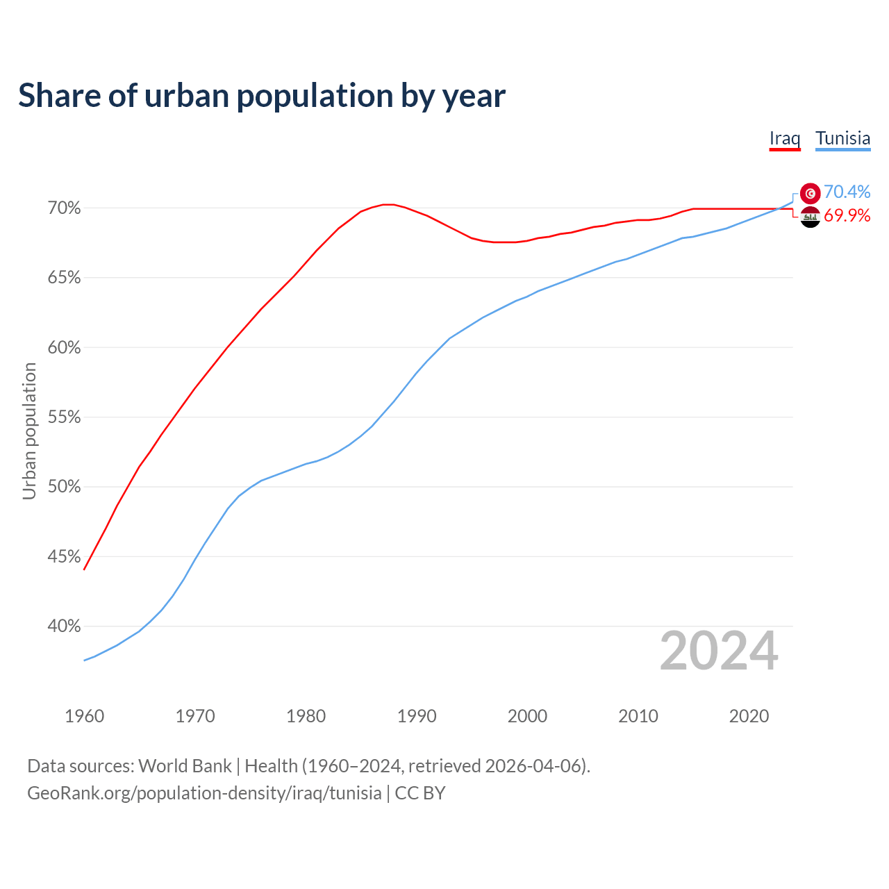From 2004 to 2024, the share of urban population changed from 68.2% to 69.9% in Iraq and from 64.9% to 70.4% in Tunisia.