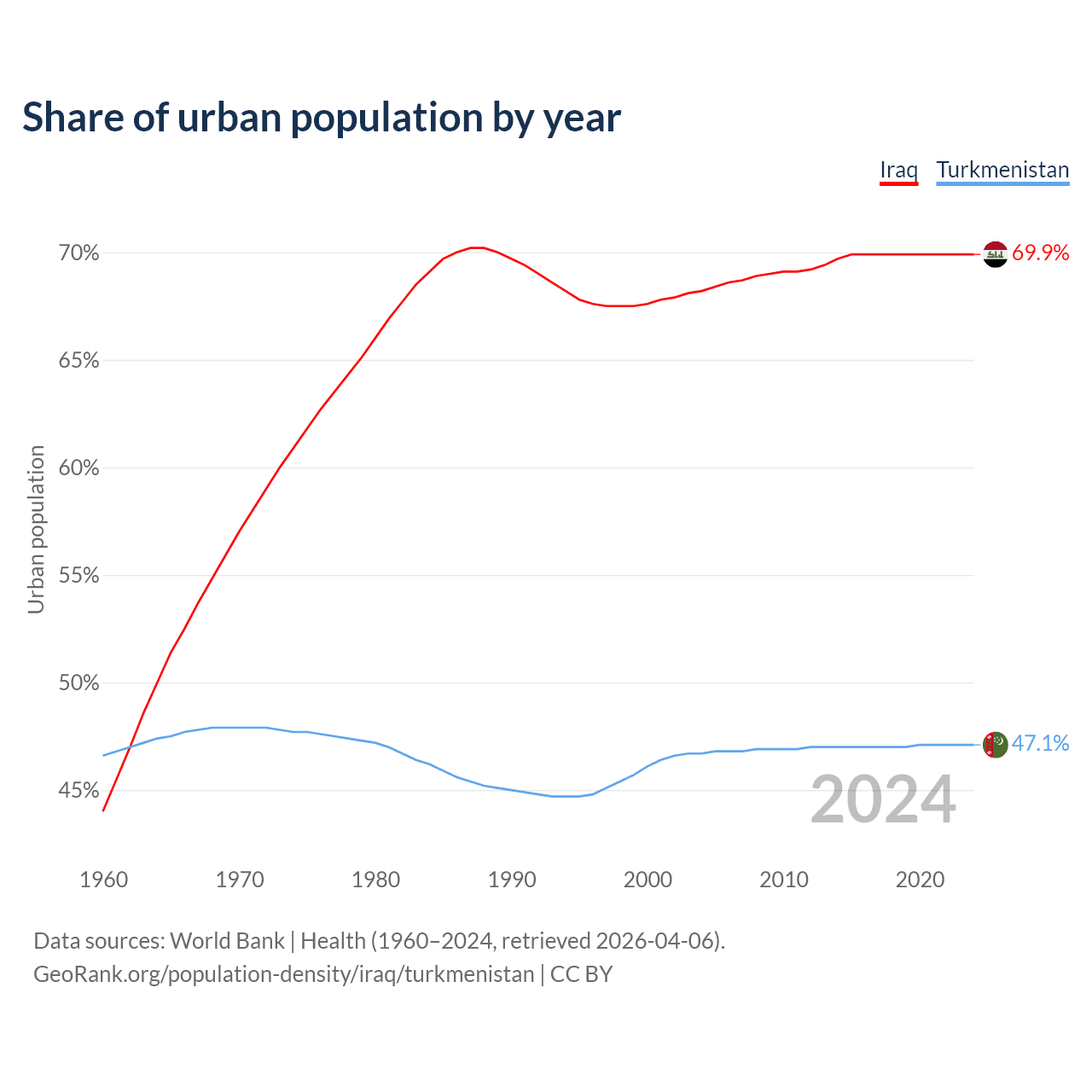 From 2004 to 2024, the share of urban population changed from 68.2% to 69.9% in Iraq and from 46.7% to 47.1% in Turkmenistan.